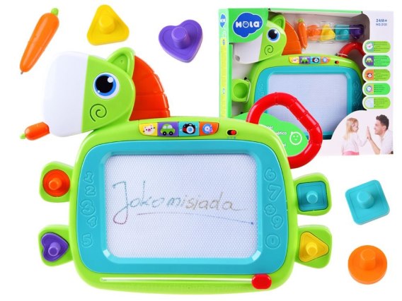 Na tablicy można malować, pisać rysikiem lub nabijać wzorki pieczątkami. Po narysowaniu rysik w kształcie marchewki można umieścić w pyszczku konika wtedy usłyszymy odgłos chrupania. Kreatywność i pomysłowość pozwoli na stworzenie przeróżnych kształtów i postaci. Wspaniale sprawdzi się do wykorzystania twórczego zapału dziecka.