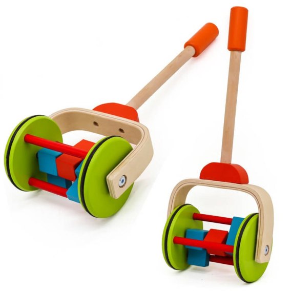 Kolorowy drewniany walec, pchaczyk dla dziecka do pchania to propozycja dla każdego maluszka zaczynającego swoja przygodę z chodzeniem. Walec na rączce wesoło obraca się wokół własnej osi, wewnątrz znajdują się kolorowe klocki, które radośnie terkoczą podczas pchania zabawki.