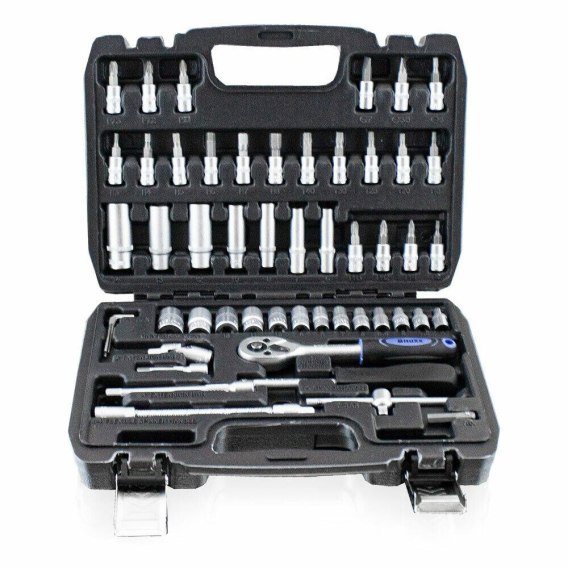 Solidny zestaw narzędzi 45 elementów  zawiera bity, nasadki, klucz zapadkowy oraz dodatkowe akcesoria które zostały wykonane z wytrzymałej, narzędziowej stali chromowo-wanadowej.  Idealny zarówno do drobnych napraw jaki i również do profesjonalnych warsztatów. Zestaw umożliwia pracę wymagającą bardzo dużych obciążeń i precyzji, pozwala wykonywać wiele czynności serwisowych związanych z odkręcaniem i przykręcaniem połączeń gwintowych o różnych rozmiarach nominalnych.Grzechotka 72 zęby (skok roboczy 5 stopni).