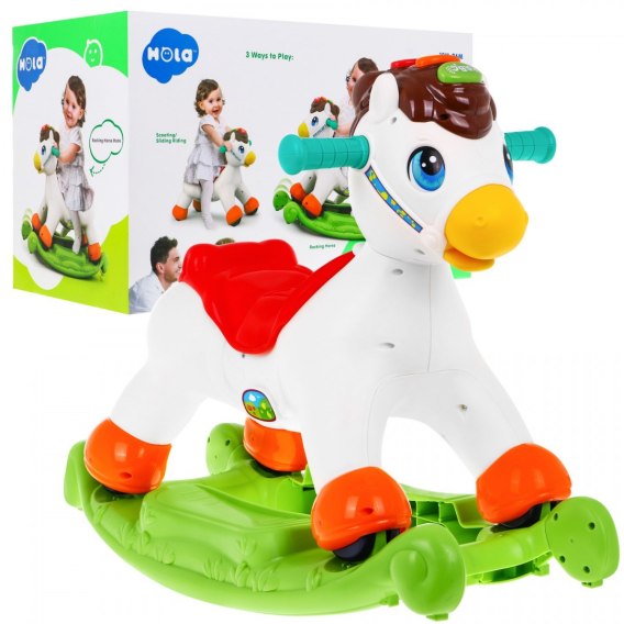| Prezentowany interaktywny zestaw posiada wielofunkcyjne zastosowanie - bujak lub jeździk. Przeznaczony jest dla dzieci między 18 a 96 miesiącem życia. Wesołej zabawie towarzyszą wesołe dźwięki (m.in rżenie, stukot kopyt czy wesołe melodyjki). Pod ruchomym siodełkiem znajduje się mały schowek, do którego mały jeździec może schować swoje skarby. Na główce konika znajdują się panel świecąco - grający. Interaktywne przyciski uruchamiają wesołe dźwięki, melodie odgłosy konika (rżenie i stukot kopyt). Funkcje zabawki: - dźwiękowe, - świetlne, - poznawcze - kształcące. |