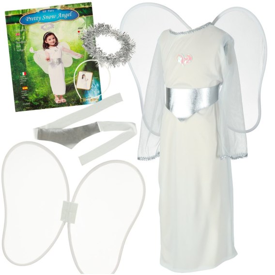czteroelementowy zestaw - przebranie składa się z białej sukienki, paska, opaski na głowę i skrzydeł