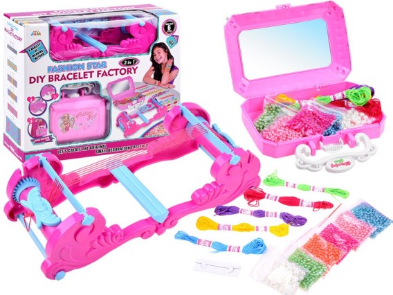 Krosno do tworzenia bransoletek + plastikowy kuferek/torebka to propozycja dla każdej małej zdolnej strojnisi, która lubi prace plastyczne, zręcznościowe. Samodzielnie stworzona biżuteria w postaci bransoletki, korali będzie zawsze najpiękniejsza i najcenniejsza. Zestaw oprócz maszynki/krosna do tkania bransoletek zawiera też kolorową mulinę, perłowe koraliki, sznur pereł, które mogą służyć jako pasek do torebki, ale też jako ozdoba ubrania się sprawdzą. Kreatywny zestaw pozwoli każdej dziewczynce stworzyć samodzielnie bransoletki z błyszczącymi koralikami, które mogą być wspaniałym prezentem dla mamy, siostry, przyjaciółki.