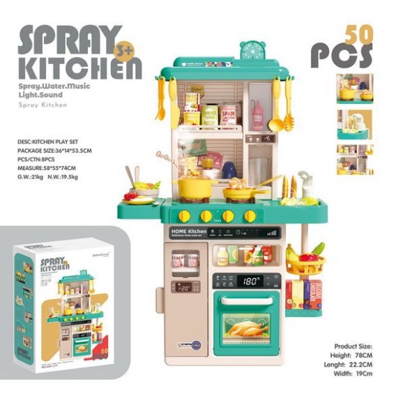 Interaktywna kuchnia z funkcją światła, dźwięku i kranikiem, z którego wydobywa się woda, a także mnóstwem akcesoriów, dla dzieci od 3-go roku życia. Kuchnia została znakomicie wykonana, z najlepszej jakości plastiku i jest w żywych kolorach zachęcających dziecko do zabawy. Na blacie kuchni znajduje się interaktywna płyta z palnikami. Po przekręceniu jednego z pokręteł słychać odgłosy gotowania, a drugiego, odgłosy smażenia. Odgłosom gotowania i smażenia towarzyszy podświetlenie palników. Z jednego z palników wydobywa się bezpieczna para wodna. Z kranu faktycznie wypływa woda, jak w prawdziwym zlewie, dziecko będzie mogło umyć zabawkowe naczynia. W zestawie mamy też atrapę lodówki z otwieranymi drzwiczkami, piekarnika oraz mnóstwo półeczek, na których ułożyć możemy atrapy produktów. Cały zestaw prezentuje się znakomicie. Zabawka zasilana jest bateriami typu 3 x 1,5 V (brak w zestawie).
