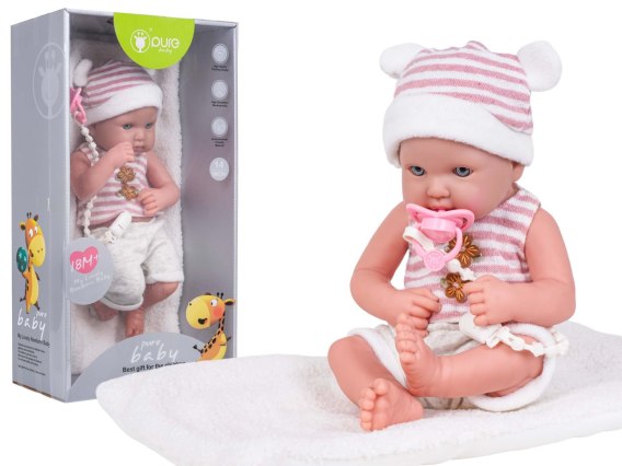 Śliczna, realistycznie wykonana laleczka bobasek z akcesoriami dla dzieci od trzeciego roku życia. Laleczka ubrana jest w czapeczkę, koszulkę i spodenki. Ma ruchome rączki i nóżki, jest bardzo miła w dotyku. Do zestawu dołączono smoczek na sznureczku i mięciutki kocyk. Lalka wygląda niezwykle realistycznie, jak prawdziwe małe dziecko.