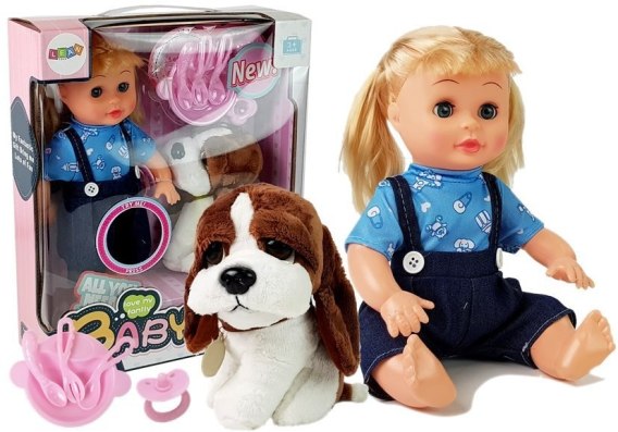 Śliczna lalka, dopracowana z każdym szczegółem, rysy twarzy i ubranko sprawiają, że wygląda bardzo realistycznie, jak mała dziewczynka. Lalka wydaje dźwięki m.in wypowiada słowo mama i płacze. Piesek jest przyjemny w dotyku .Do zestawu dołączona jest smoczek oraz miseczka i sztućce, dzięki którym można nakarmić laleczkę. Decyzja należy do twojego malucha czy będzie chciał się bawić tylko lalką czy też może pieskiem, albo razem.
