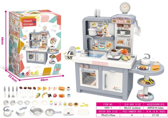 Interaktywna, bogato wyposażona kuchnia z efektami dźwięku, światła i pary dla dzieci od trzeciego roku życia. Wszystkie elementy zestawu wykonano z najlepszej jakości bezpiecznych dla dzieci materiałów. Kuchnia utrzymana jest w szaro - białej tonacji, będzie pasowała do każdego dziecinnego pokoju. Zabawkowa kuchnia posiada kuchenkę mikrofalową, zlew z kranikiem, kuchnię indukcyjną, piekarnik, ekspres do kawy, lodówkę, stojak na desery i mnóstwo akcesoriów kuchennych, takich jak garnki, sztućce, talerze, czajnik, kubeczki oraz atrap produktów spożywczych. Z kranika naprawdę leje się woda, kuchenka indukcyjna jest podświetlana, ma wyświetlacz temperatury oraz wydaje realistyczne dźwięki gotowania i smażenia. Dodatkową atrakcją kuchni jest wydobywająca się bezpieczna (chłodna) para z jednego z garnków. Kranik zasilany jest bateriami typu 2 x 1,5V AA (brak w zestawie), płyta indukcyjna bateriami 3 x 1,5V AAA (baterii brak w zestawie).