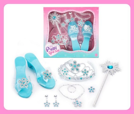 Bogato wyposażony zestaw małej księżniczki dla dzieci od 3-go roku życia. Zestaw wykonany został z dbałością o szczegóły i znajduje się w nim tiara, naszyjnik, czarodziejska różka, pantofelki na obcasie, pierścionek oraz kolczyki. Każda mała dziewczynka poczuje się w nim jak księżniczka. Detale w tym zestawie wykonane zostały z plastikowych diamentów i imitacji kamieni szlachetnych, w srebrno-niebieskiej kolorystyce. Wszystko zapakowane w pudełko, idealne na prezent.