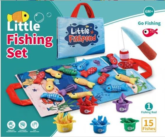 Miękki sensoryczny zestaw do łowienia rybek dla maluszków od szóstego miesiąca życia. Zestaw wykonany został z materiałów bezpiecznych dla dzieci w żywych kolorach, stymuluje dziecko na wielu płaszczyznach. Żywe kolory przyciągają uwagę dziecka i zachęcają do chwytania i zabawy. Na zestaw składają się: materiałowa mata z rysunkiem przedstawiającym morze i zwierzątka morskie, 15 miękkich kolorowych rybek, 5 kubeczków oraz wędka na rzepy. Rybki są w 5 wersjach kolorystycznych tak jak kubeczki. Na kubeczkach znajdują się numerki od 1 do 5. Maluszek musi złowić rybkę i włożyć ją do konkretnego kubeczka pasującego kolorem do koloru rybki. Liczba rybek w kubeczku powinna być zgodna z numerkiem na kubku. Mata posiada wszyte 2 rączki do przenoszenia, można włożyć do jej środka wszystkie elementy zestawu i zabrać je wszędzie ze sobą. Z tym zestawem maluszek ćwiczy koordynację ręka-oko, stymuluje wzrok, dotyk, precyzję. Poznaje kształty, kolory, uczy się przypasowywać i liczyć.