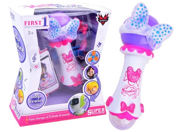 Mikrofon posiada funkcję nagrywania, i odtwarzania, ma również wejście na MP3 co pozwoli na śpiewanie ulubionych piosenek do oryginalnego podkładu. Mikrofon daje jeszcze możliwość zmiany głosu dziecka na pięć różnych styli, co może uatrakcyjnić każdą zabawę.