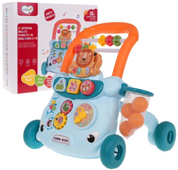 Interaktywny jeździk, pchaczyk dla dzieci od 18-go miesiąca życia. Jeździk wykonany został z najlepszej jakości plastiku w żywych kolorach, przyciągających wzrok dziecka. Ma stabilną konstrukcję, którą dodatkowo można obciążyć wodą lub piaskiem oraz szeroki rozstaw kół. Z boku jeździka znajduje się kosz na piłki, a w zestawie cztery dodatkowe piłeczki. Na przodzie jeździka mamy panel interaktywny z mnóstwem przycisków do wciskania, przekręcania, przekładania. Po lewej stronie panelu znajdują się 3 kółeczka zębate do kręcenia oraz labirynt z kulkami do przekładania. Po prawej stronie mamy zegar z ruchomymi wskazówkami. Na górze znajduje się sorter kształtów z 3 klocuszkami do dopasowania. Nad sorterem umieszczono pianinko z czterema klawiszami z melodyjkami i odgłosami zwierzątek. Pianinko dziecko może wyjąć z panelu i zabrać wszędzie ze sobą. Nad pianinkiem znajduje się liczydło z 6 dużymi koralikami. Pianinko zasilane jest bateriami typu 2 x AAA 1,5 V (brak w zestawie). Funkcje zestawu: - odpowiedni dla dzieci od 18-go miesiąca życia, - wykonany z najlepszej jakości plastiku, - stabilna konstrukcja z możliwością dodatkowego obciążenia, - szeroki rozstaw kół, - kółeczka z gumowym bieżnikiem, - wygodna rączka, - kosz na piłki, - multifunkcyjny panel, - zegar z ruchomymi wskazówkami, - kółka zębate do kręcenia, - przekładanka, - pianinko z muzyczkami i odgłosami zwierzątek, - liczydło. |