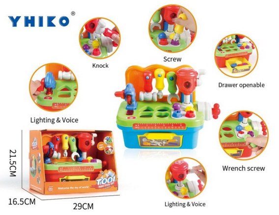 Multifunkcyjna, interaktywna zabawka z funkcją dźwięku i światła to propozycja dla dzieci od 24-go miesiąca życia. Warsztat majsterkowicza wyposażony jest w szereg rozmaitych funkcji. Znajdziemy tu obracającą się tarczową piłę oraz młot udarowy. Każde z narzędzi wyposażone jest w praktyczną rączkę, za pomocą której uruchomimy go. Na blacie warsztatu zamontowano imadło, które pozwoli naszemu maluszkowi nauczyć się odruchu przykręcania i odkręcania, czemu będą towarzyszyć odgłosy grzechotania. W warsztacie znajdziemy gwoździe do wbijania i śrubki do przykręcania. Dodatkowe wyposażenie to narzędzia: śrubokręt, klucz francuski i młotek, wszystko w proporcjach znakomicie nadających się do małych dziecięcych rączek. Warsztat to również znakomite miejsce do ćwiczenia umiejętności rozpoznawania kształtów i dopasowywania ich do siebie. Blat warsztatu wyposażono w sorter, znakomicie rozwijający umiejętności dziecka. Wszystkie elementy, które dopasujemy do odpowiednich otworów, znajdziemy w praktycznej szufladzie na spodzie zabawki. Warsztat zasilany jest bateriami typu 3 x AG13, baterie znajdują się w zestawie. Specyfikacja warsztatu: - żywe, przyjemne dla oka kolory, - obracająca się piła tarczowa ze światłem i dźwiękiem, - ruchomy młot udarowy ze światłem i dźwiękiem, - ruchome imadło z ruchem wysuwania i chowania, - otwierana szuflada do przechowywania akcesoriów warsztatowych, - sorter z kształtami, - możliwość wbijania gwoździ za pomocą młotka, - możliwość wkręcania i wykręcania śrubek za pomocą klucza lub śrubokrętu. |