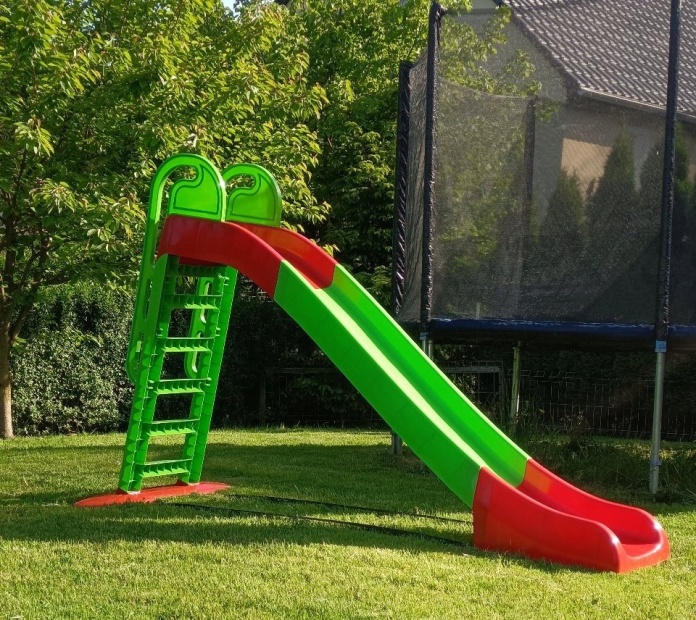 Zjeżdżalnia ma wytrzymałą i stabilną konstrukcję, dzięki czemu gwarantuje bezpieczną zabawę. Pod drabinką znajduje się stopka, która zabezpiecza, aby zjeżdżalnia nie przewróciła się na boki, ponadto całość spięta jest pasami, które łączą ślizg z drabinką - zabezpieczają, aby całość konstrukcji była stabilna.