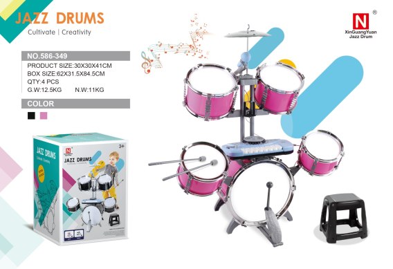 Duża czarna perkusja z keyboardem i mikrofonem w zestawie dla dzieci od 3-go roku życia. Perkusja wykonana została z bezpiecznych, wysokiej jakości materiałów. Z wyglądu przypomina profesjonalny instrument. Wyposażona jest w pięć bębnów, talerz, komplet pałeczek, mikrofon oraz keyboard. W zestawie znajduje się również taboret. Keyboard posiada wiele ciekawych funkcji takich jak mikser, wgrane melodie, wersję demo, możliwość nagrywania i odtwarzania,  oraz wejście na mikrofon i MP3. Keyboard zasilany jest bateriami typu 4 x AA 1,5V (w zestawie). Zabawa tym zestawem rozwija umiejętności muzyczne, zmysł słuchu i uczy odróżniać dźwięki.