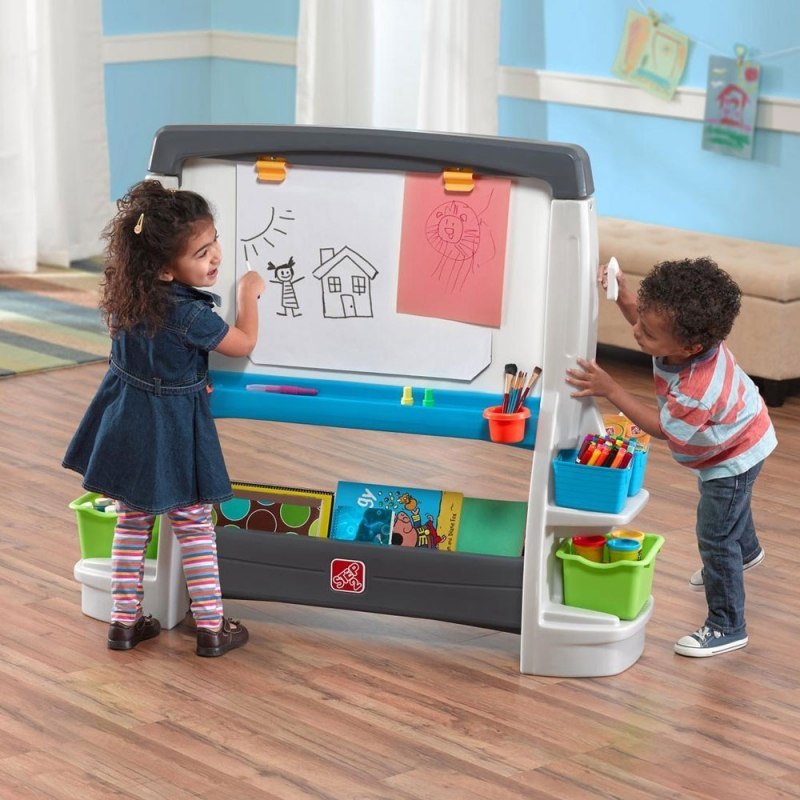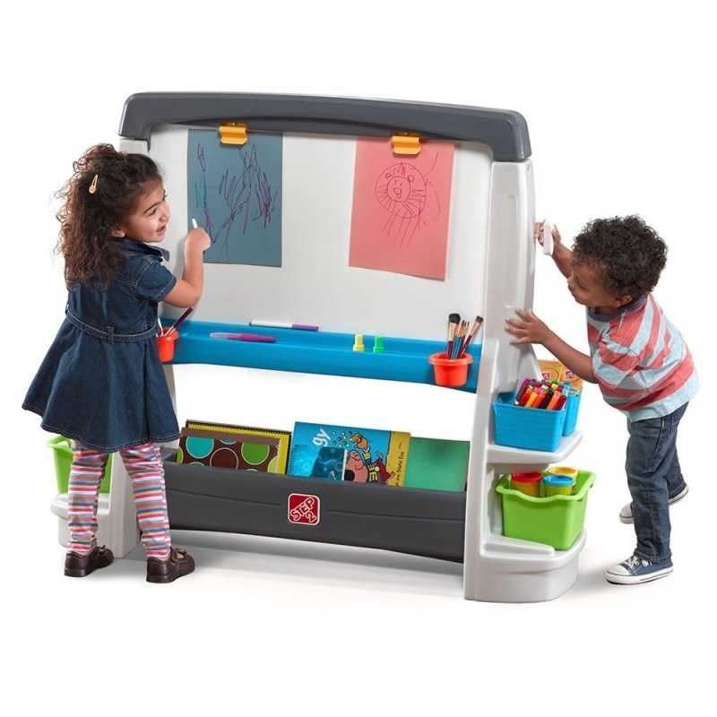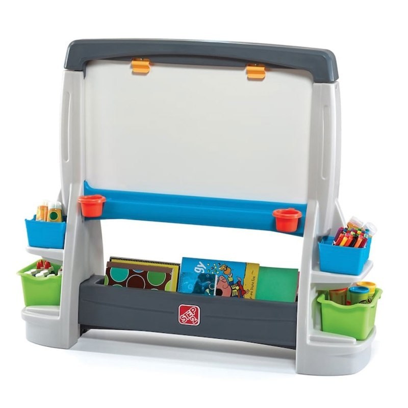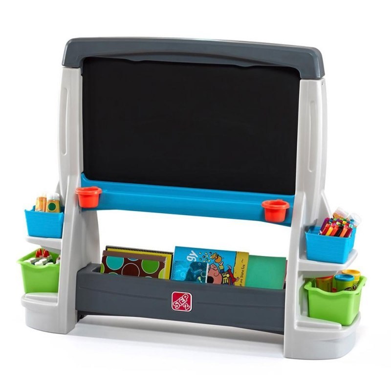 Ogromna dwustronna tablica Step2 zestaw małego artysty to wspaniały pomysł na prezent. Od teraz każdy mały artysta będzie mógł tworzyć własne arcydzieła. Tablica jest dwustronna - z jednej strony to klasyczna tablica kredowa a z drugiej powierzchnia przeznaczona do malowania zmywalnymi flamastrami. Dodatkowo nad tablicą kredową znajdują się dwa klipsy na kartki. Żywe kolory, kształty i tekstury, z jakich wykonano sztalugę, zachęcą maluchy do kreatywnej i twórczej zabawy. Po skończonej zabawie, dzieci mogą przechowywać swoje kredki i flamastry w pojemnikach znajdujących się pod tablicą.