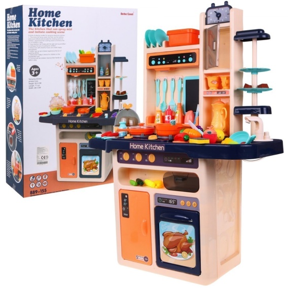 Przedstawiamy rewelacyjną, bogato wyposażoną, dużą, multifunkcyjną kuchnię. Kuchnia posiada zlew z kranem z prawdziwą wodę, sensoryczne palniki indukcyjne, ruchome pokrętła, okap z lampką i panelem dźwiękowym, otwierany piekarnik, otwieraną lodówkę, zegar, jajowar, półeczki i liczne akcesoria kuchenne. Palniki wydają odgłosy gotowania a towarzyszy im miganie czerwonego światełka. Dodatkową atrakcją kuchenki jest wydobywa się para z jednego palnika, imitująca gotowanie się potrawy. W akcesoriach kuchennych znajduje się jajowar zasilany bateriami, który „gotuje" jajka, wydaje dźwięki i migocze światełkami. Cały zestaw składa się z 65 elementów. Dbałość o szczegóły, żywa kolorystyka, estetyczne wykonanie, łatwy montaż i demontaż. Zabawka zasilana jest bateriami typu 8 x AA (brak w zestawie).