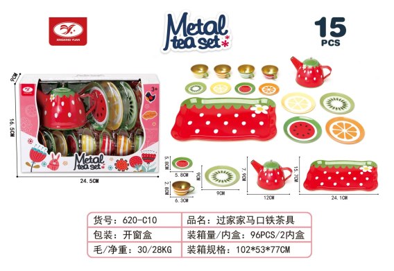 Metalowy, owocowy zestaw do herbaty dla dzieci powyżej trzeciego roku życia. Zestaw składa się z 15 elementów i zawiera wszystko, co niezbędne by Twoja pociecha mogła zaserwować herbatkę. W zestawie znaleźć możemy czajniczek, filiżanki, spodki, talerzyki czy tacę. Elementy zestawu wykonano z metalu i pokryto bezpieczną, nietoksyczną farbą w żywych kolorach.