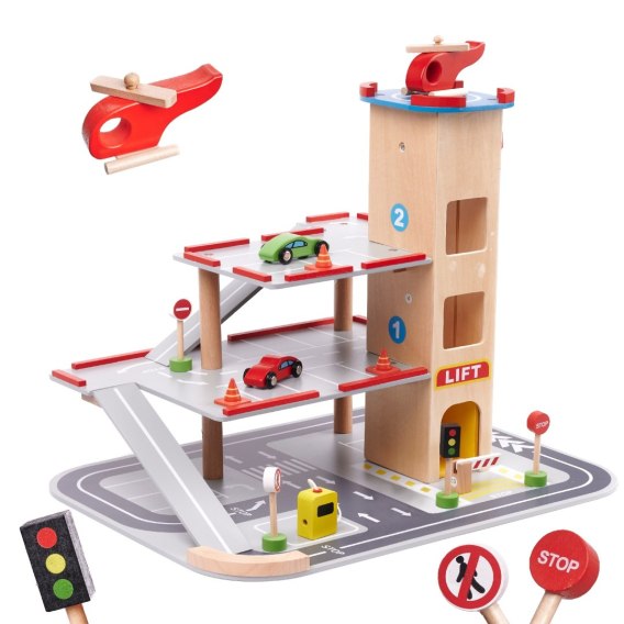 Przepiękny drewniany garaż miejski ma aż cztery poziomy! Pierwsze trzy przeznaczone są dla aut - znajdzie się tam miejsce dla drewnianych samochodzików dołączonych do zestawu, a także wielu innych pojazdów Twojego dziecka. Na kolejne piętra dostaną się one przy pomocy windy!