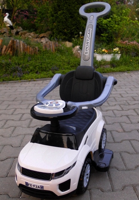 Jeździk - autko dla dzieci od 1-go roku. Rośnie wraz z dzieckiem: wraz z wiekiem dziecka demontujemy pchacz, poręcz zabezpieczającą, podnóżek. Pojazd posiada dźwięki i światełka.