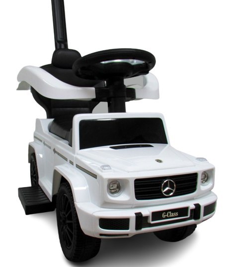 KOLOR: BIAŁY Sportowy dziecięcy jeździk, Pchacz - Model MERCEDES AMG G350MUZYKA + KLAKSON Licencja MERCEDES Pchacz po ściągnięciu rączki, podnóżka oraz barierek zabezpieczających staje się jeździkiem. Uwaga! Barierki nie blokują kierownicę. Kierownica jest skrętna zarówno dla wersji pchacz jak i jeździk!