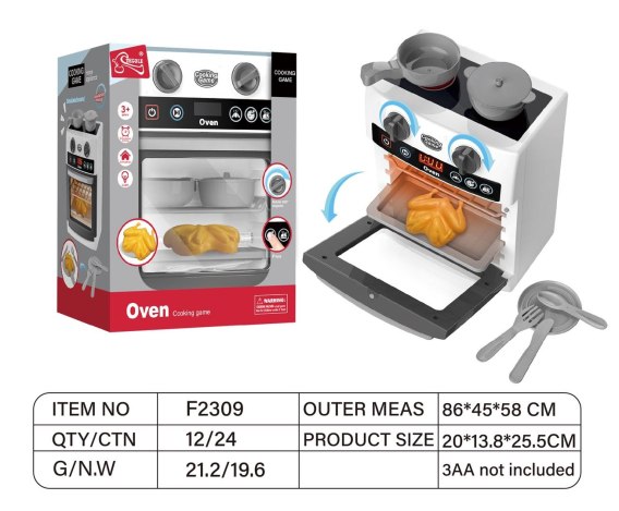 Interaktywny piekarnik z funkcją dźwięku i światła dla dzieci od trzeciego roku życia. Piekarnik wykonano z dbałością o szczegóły, przypomina i zachowuje się tak jak prawdziwy piekarnik. Piekarnik posiada otwierane drzwi, ruchome pokrętła oraz panel odpowiedzialny za efekty dźwiękowe i świetlne. W zestawie znajdują się akcesoria takie jak atrapa kurczaka, patelnia, garnek z pokrywką, talerzyk oraz sztućce. Zabawka zasilana jest bateriami typu 3 x AA 1,5V (brak w zestawie).