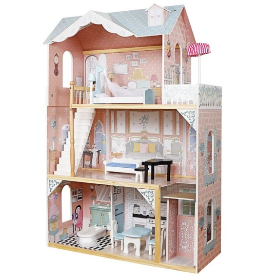 Niezwykle duży, drewniany domek w stonowanych, pastelowych kolorach to wymarzona zabawka dla każdej małej dziewczynki. Dzięki solidnej konstrukcji i eleganckiemu designowi domek ten zapewni wiele lat kreatywnej zabawy.