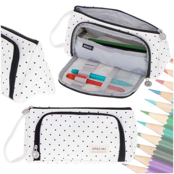 PIÓRNIK SZKOLNY PODWÓJNY SASZETKA KOSMETYCZKA BIAŁY W KROPKI
