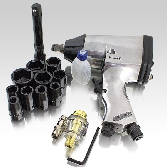 Klucz pneumatyczny jest to urządzenie przeznaczone dla domowego majsterkowicza,jak i fachowca. Poręczne, lekkie, urządzenie pneumatyczne ma szerokie zastosowanie w montażu i demontażu wszystkich połączeń śrubowych. Nasadki wykonane zostały z specjalnej odmiany stali (CrV) chromowo-wanadowa. Chrom i wanad gwarantuje odporność na korozję, utlenianie, ścieranie i dużą wytrzymałość materiału. W zestawie dołączona jest przedłużka umożliwiająca dostanie się do oddalonych połączeń śrubowych. Klucz pneumatyczny posiada funkcje obrotów w obie strony prawo/lewo.