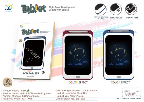 Interaktywny tablet, na którym piszemy lub malujemy w kolorze, to gadżet przeznaczony dla dzieci od 3-go roku życia, ale z powodzeniem może być również używany przez dorosłych jako notatnik. Jest lekki i cienki, przekątna ekranu to 10", można go zabrać wszędzie ze sobą, do przedszkola, szkoły, pracy. W górnej części tabletu znajduje się uchwyt na rysik, a pod spodem tabletu umiejscowiony jest suwak, który zabezpiecza przez usunięciem powstałych na tablecie zapisków czy rysunków. Jeżeli funkcja blokady jest wyłączona, usunąć rysunek możemy za pomocą jednego kliknięcia w przycisk znajdujący się, w dolnej części tabletu. Zasada działania tabletu jest prosta, piszemy lub malujemy na ekranie tabletu za pomocą rysika i usuwamy za pomocą jednego kliknięcia. Jeżeli akurat pod ręką nie mamy rysika, rysować na tablecie możemy również paznokciem bez obawy o jego porysowanie. Zabawka zasilana jest bateriami typy CR2032, które znajdują się w zestawie. |