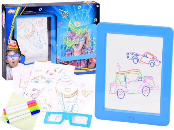 Podświetlana tablica do tworzenia neonowych rysunków przypadnie do gustu każdemu artyście. Kreatywna tablica ma opcję podświetlania, gdzie można stworzyć samodzielnie rysunek lub go odrysować z kart dołączonych do zestawu. Dzieci, które lubią malować, rysować znajdą tu mnóstwo frajdy w tworzeniu swoich unikatowych rysunków. Zestaw sprawi ogromną frajdę każdemu artyście. Wystarczy tylko użyć wyobraźni i za pomocą dołączonych neonowych kolorowych pisaków (zielony, niebieski, pomarańczowy i różowy) tworzyć niezwykłe rysunki obrazy. Zestaw zawiera pomocnicze obrazki rysunki dzięki, którym łatwiej będzie naszkicować swoje własne dzieła sztuki. Ukończone arcydzieła należy umieścić w podświetlonej światłem LED tablicy. Dziecko za pomocą dołączonych okularów 3D będzie mogło oglądać swoje obrazy w trójwymiarowym wymiarze co dodatkowo sprawi jeszcze więcej radości. Komplet zawiera również ściereczkę, dzięki której możemy tworzyć nieograniczoną liczbę rysunków. Samodzielnie stworzony obrazek, świetnie sprawdzi się jako dekoracja pokoju oraz lampka.