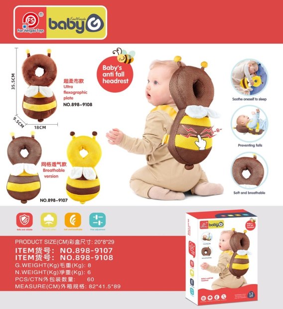 Wielofunkcyjny ochraniacz dla dzieci uczących się chodzić od dwunastego miesiąca życia. Zestaw przypomina plecaczek w kształcie pszczółki, rolą jego jest zabezpieczenie maluszka przed urazem głowy podczas upadania. Może jednak pełnić również rolę poduszki czy przytulanki. Ma ergonomiczny kształt, jest lekka, nie krępuje ruchów malucha oraz łatwa do dopasowania dzięki regulowanym paskom. Ochraniacz zakłada się na plecki maluszka jak plecaczek.