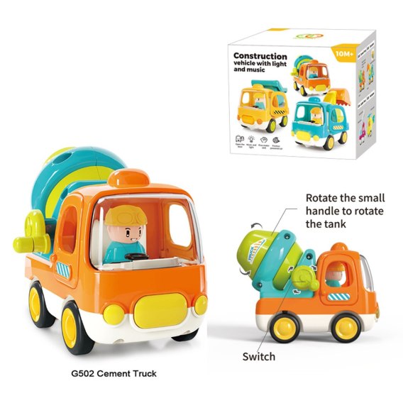 Funkcje: - dla dziecka od dziesiątego miesiąca życia, - zabawka wykonana z najlepszej jakości tworzywa sztucznego, - efekty dźwiękowe: wesołe melodie (przycisk z przodu pojazdu), odgłos odpalania pojazdu i klakson (przyciski w środku kabiny), - efekty świetlne: mrugający przycisk uruchamiający melodie, - ruchome elementy: drzwi boczne kabiny, gruszka do betonu (na korbkę), - gumowe opony, - napęd friction. |