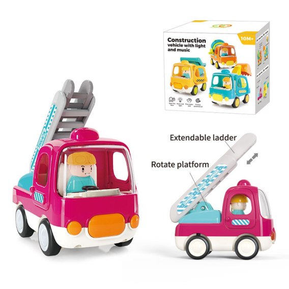 Funkcje: - dla dziecka od dziesiątego miesiąca życia, - zabawka wykonana z najlepszej jakości tworzywa sztucznego, - efekty dźwiękowe: wesołe melodie (przycisk z przodu pojazdu), odgłos odpalania pojazdu i klakson (przyciski w środku kabiny), - efekty świetlne: mrugający przycisk uruchamiający melodie, - ruchome elementy: drzwi boczne kabiny, wysięgnik z drabiną możemy wysuwać i obracać go o 180 stopni, - gumowe opony, - napęd friction. |