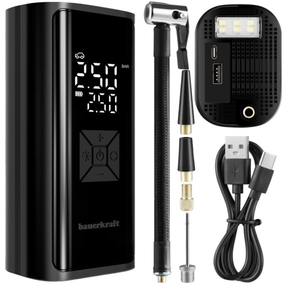 - Cyfrowy wyświetlacz umożliwia bieżące monitorowanie wartości ciśnienia oraz poziomu naładowania akumulatora. Dane prezentowane są w czasie rzeczywistym, dzięki czemu użytkownik ma pełną kontrolę nad procesem pompowania i może łatwo dostosować ustawienia do aktualnych potrzeb.