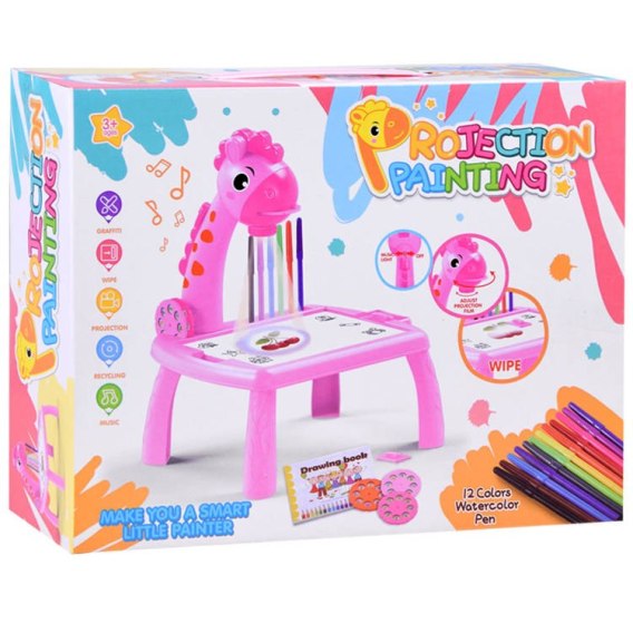Rzutnik Żyrafa to uroczy zestaw do zabawy dla każdego dziecka, które lubi prace plastyczne, rysować, malować, oglądać obrazki i tworzyć własne unikatowe historie i opowieści. Rzutnik żyrafa posiada blat na którym dziecko będzie mogło poukładać pisaki, i rysować, odrysowywać wyświetlane obrazki z rzutnika. Blat można położyć płasko na własnym biurku, stole lub można przymocować mu cztery nogi aby powstało małe biurko. Zastosowanie rzutnika jest szerokie, można wyświetlać obrazki typu (zwierzęta, pojazdy, owoce) na kartce, biurku ale i także na ścianie wieczorem. Projektor bardzo ładnie wykonany sprawi wiele frajdy podczas zabawy.