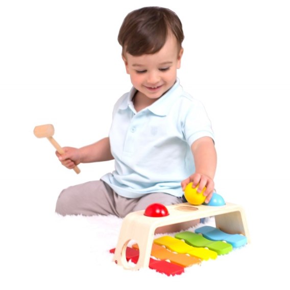 - - Dziecko może wbijać kolorowe kulki przy pomocy młotka, a w efekcie tej zabawy wpadają one do środka, uderzając w cymbałki i wydając dźwięki.