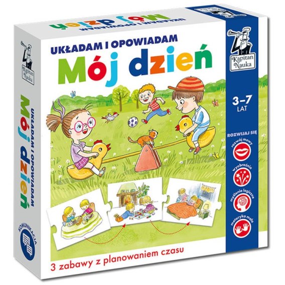 Zestaw zawiera 24 dwustronne puzzle, które można łączyć w dowolny sposób. Dziecko ma zatem do dyspozycji aż 48 scenek ukazujących codzienne czynności, zabawy czy atrakcje, z których może ułożyć swój zwykły rozkład dnia albo stworzyć plan na wyjątkową okazję. Układanie historyjek zachęca do opowiadania, relacjonowania wydarzeń i wyrażania uczuć. Można snuć opowieści z własnej perspektywy lub wcielić się w towarzysza przygód i spróbować opisać tę samą sytuację inaczej.