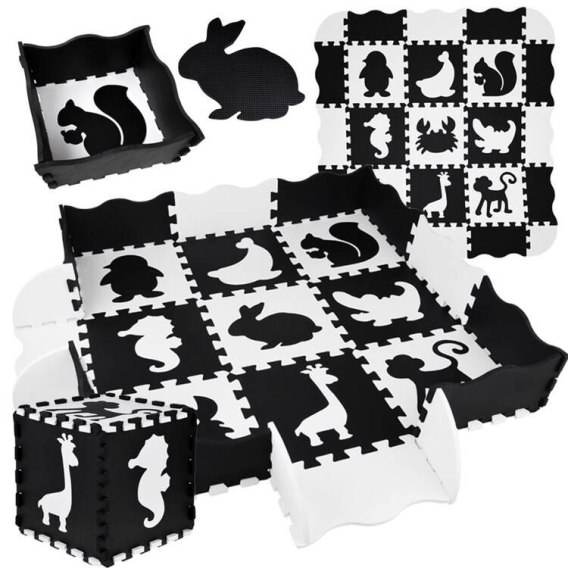 Mata piankowa dla niemowląt i dzieci składająca się z miękkich puzzli w kontrastowych odcieniach czerni i bieli. Komplet składa się z 16 puzzli piankowych. Dzięki uniwersalnej kolorystyce, będzie pasować do każdego pokoiku dziecięcego.