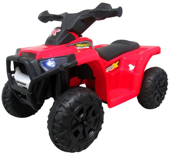 kumulator 6V, silnik 25 Wat, wyłącznik zasilania, ładowarka (wejście 220-230 V), amortyzatory (sprężyny) na przednich kołach, świecące światła przednie, melodyjki i klakson na pokrywie "baku", dźwięk odpalanego silnika przy włączeniu quada, gąsienica na kołach z tworzywa, 4 koła (dwa z przodu, dwa z tyłu), 2 biegi (przód i tył), pedał gazu, owiewki na kierownicy, zderzak,