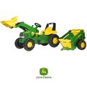 Traktorek rollyJunior wykonany na licencji John Deere z łyżką i przyczepką od marki Rolly Toys to jeden z najlepszych traktorków dla dzieci dostępnych na rynku. Zabawka to spełnienie marzeń niejednego małego traktorzysty. Starannie wykonany, z dbałością o najmniejszy szczegół. Żaden Prawdziwy Farmer by takim nie pogardził. Idealny prezent na każdą okazję. Ten zielony traktor na pedały to idealna zabawka dla dzieci  od 3 lat. Zabawka posłuży Twoim dzieciom przez wiele lat, zapewniając im nie tylko doskonałą zabawę, ale również rozwijając ich zdolności motoryczne oraz koordynację ruchową. Konstrukcja traktora gwarantuje pełne bezpieczeństwo podczas zabawy dzięki zabudowanemu układowi mechanicznemu, który chroni dziecko przed przypadkowymi urazami. Dodatkowo maska traktorka jest podnoszona, dzięki czemu dziecko może bawić się w naprawianie swojego pojazdu. Dodatkowe funkcje, takie jak ruchoma łyżka i odczepiana przyczepka, urozmaicają zabawę, pozwalając dziecku na przewożenie różnych przedmiotów oraz symulację pracy na farmie. Otwierana przednia maska dodaje realizmu i umożliwia dziecku jeszcze bardziej interaktywną zabawę. Kołpaki oraz solidny mechanizm przekładni łańcuchowej zapewniają trwałość i niezawodność zabawki.