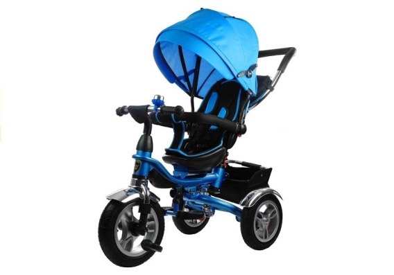 Dużą zaletą prezentowanego trójkołowca jest solidna i trwała rama w kolorze niebieskim. Uwagę przechodniów zwrócą błyszczące, chromowane błotniki umieszczone nad każdym z kół, w pełni rozkładany baldachim z daszkiem chroniący przed ostrym słońcem lub wiatrem, w którego górnej części umieszczono siateczkę zwiększającą przepływ powietrza i miękki, dopasowany kolorystycznie pokrowiec na siedzisko połączony z szelkami i pasem bezpieczeństwa.