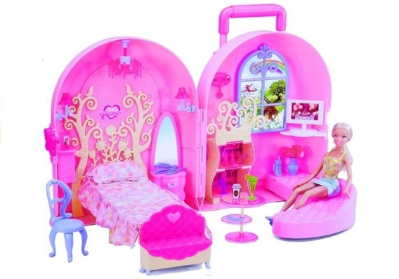 Złożony domek przypomina bardzo dziewczęcą, pastelową walizeczkę z długą rączką. Jasne, różowo-fioletowe kolory połączone są z białymi dodatkami, co z pewnością spodoba się każdej dziewczynce. Wnętrze walizeczki kryje kompletny zestaw elementów potrzebnych do zabawy lalką.