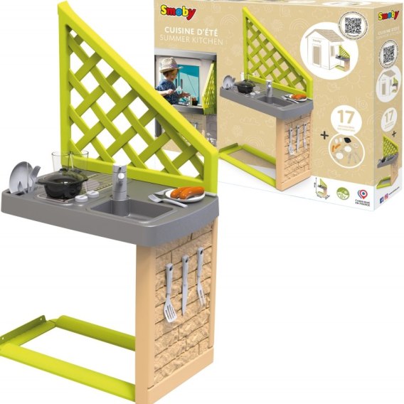 Kuchnia letnia od firmy SMOBY to idealne uzupełnienie domku Neo Jura, który dzięki niej staje się bardziej realistyczny! Dzieci mogą dostosować swój domek do własnych upodobań, wyposażając go w kuchnię letnią. Sprawi to, że domek będzie przypominał prawdziwy dom. Dzieci mogą cieszyć się zabawą w gotowanie smacznych potraw na "grillu" i korzystać z 17 akcesoriów: kiełbasek, szklanek, talerzy, sztućców, Wszystko, co potrzebne do miłego spędzenia czasu w ogrodzie! Kuchnia letnia, podobnie jak domek Neo Jura, jest odporna na działanie promieni UV, dzięki czemu zachowuje swoją wytrzymałość i żywe kolory przez długi czas. Drzwi są przeznaczone dla dzieci od 2 roku życia. Produkt wykonano we Francji.