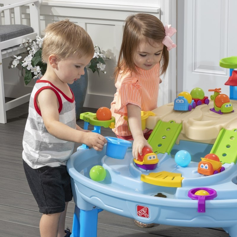 Dwupiętrowy stół dla dzieci Step2 Ball Buddies Adventure Center! Oprócz klasycznej wywrotki Ball Buddies, ten stół do zabawy na zewnątrz dla dzieci zawiera helikopter Ball Buddies, łódź i pociąg - które mogą przewozić dwie piłki do zabawy w tym samym czasie! Ball Buddies nie mogą się doczekać przygody wokół rzeki lub rejsu po zakrętach odlewanych dróg i mostów. Dzięki dużemu obszarowi, wielu dołączonym akcesoriom i wielu sposobom zabawy, ten dziecięcy stół wodny jest doskonałą opcją do zaangażowania się w zabawę społeczną dla wielu dzieci. Ponadto poszczególne stacje wokół basenu oferują dodatkowe opcje dla najmłodszych, którzy chcą bawić się sami. Mali poszukiwacze przygód mogą używać obręczy do rzucania piłek do wody i cieszyć się ekscytującą zabawą wodną za pomocą koła wodnego i dołączonych miarek. Na dnie znajduje się nawet interaktywne koło, dzięki czemu maluchy mogą wprawić wodę w ruch i stworzyć płynącą rzekę.