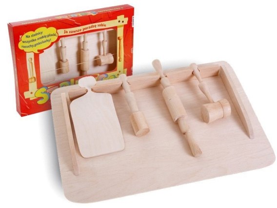 Drewniana stolnica z przyborami dla małego pomagiera mamy, taty lub babci sprawdzi się w każdej kuchni.