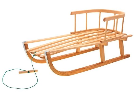 Sanki dziecięce w całości wykonane z drewna polakierowane bezbarwnym lakierem.
