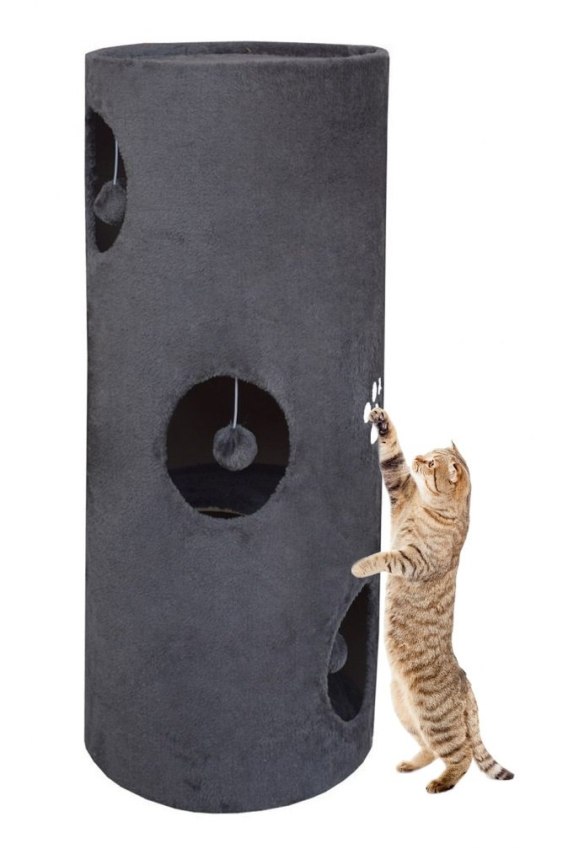 Drapak w większości jest pokryty pluszem- niezwykle miękkim i przyjemnym materiałem. Jeżeli Twój kot lubi się ocierać o meble to z pewnością pokocha Nasz drapak, który jest przystosowany właśnie dla takich kotów. W górnej części okienka wmontowany jest pomponik na sznurku, który będzie świetną atrakcją dla Twojego kota.