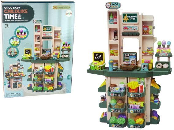 Zabawka "Sklep" to kompleksowy zestaw dostarczający dzieciom możliwość rozwijania umiejętności społecznych i kreatywności poprzez udawanie zakupów i prowadzenie własnego sklepu. Cały zestaw zawiera imponujące 71 elementów, co czyni go pełnym wyposażeniem do realistycznej i ciekawej zabawy.