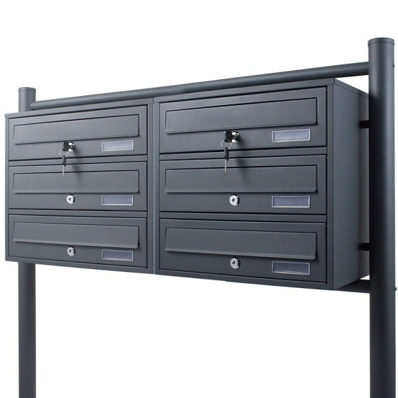 Dzięki ponadczasowej, eleganckiej konstrukcji oraz wykonaniu ze stali nierdzewnej system Euro skrzynek na listy doskonale sprawdza się w firmach oraz na osiedlach mieszkaniowych. Ze względu na zwartą konstrukcję, system letterbox 6 skrzynek zajmuje niewiele miejsca. Montaż jest w ten sposób łatwy i szybki. Zakres dostawy obejmuje materiały montażowe do betonowych fundamentów.