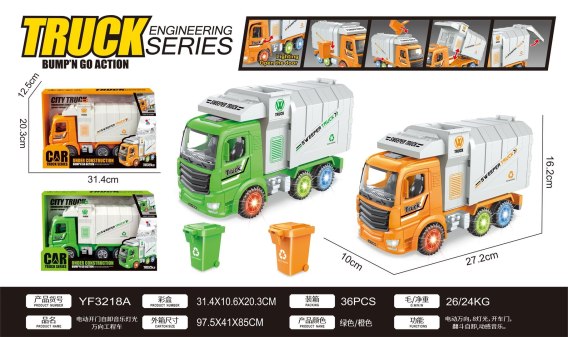 Interaktywna śmieciarka z funkcją dźwięku i światła dla dzieci od trzeciego roku życia. Śmieciarka wykonana została z najlepszej jakości tworzywa sztucznego, z dbałością o szczegóły. Kółeczka pojazdu są podświetlane, a na spodzie znajduje się obrotowe kółeczko umożliwiające jazdę we wszystkich kierunkach. Zabawka wydaje odgłosy jazdy, klaksonu, hamowania i wesołej melodii. Podczas jazdy otwierają się też drzwi ciężarówki, podnosi i opuszcza kontener, świecą przednie światła. Kosz na śmieci dołączono do zestawu, można go zaczepić o bok śmieciarki i kiprować z niego śmieci bezpośrednio do zsypu, ponadto możemy podnosić kontener oraz jego tylną klapę (manualnie). Zabawka zasilana jest bateriami typu 3 x AA 1,5 V (brak w zestawie). Funkcje: - dla dzieci od trzeciego roku życia, - zabawka wykonana z najlepszej jakości tworzywa sztucznego, - efekty świetlne: podświetlane koła, przednie reflektory, - efekty dźwiękowe: odgłosy jazdy, hamowania, klaksonu, wesoła melodia, - funkcje elektryczne: jazda we wszystkich kierunkach, podnoszenie i opuszczanie kontenera, otwierane drzwi ciężarówki, - funkcje manualne: podnoszony i opuszczany kontener, otwierana klapa kontenera, kiprowanie kosza. |