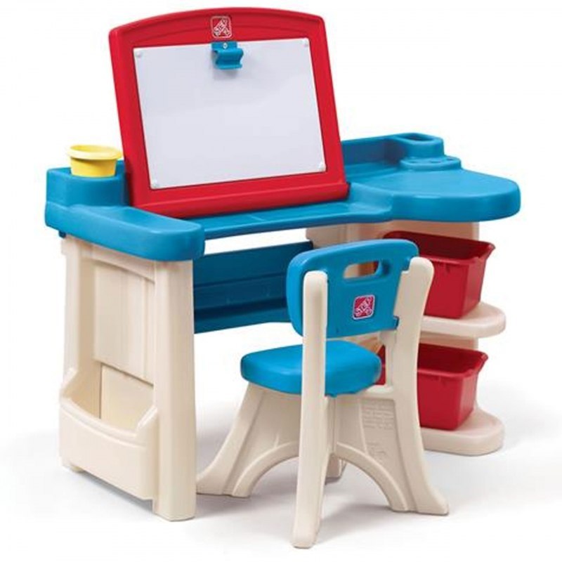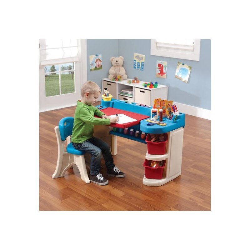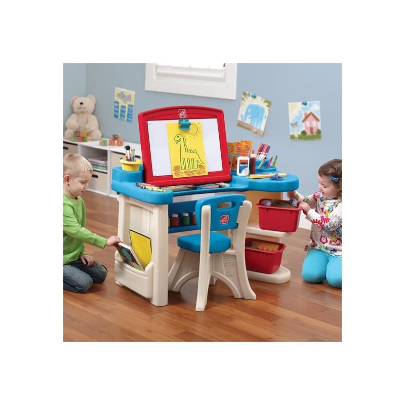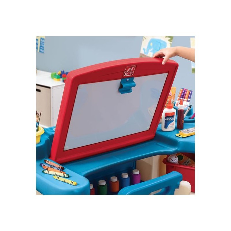 Stabilne biurko z ogromną ilością przegródek i schowków gwarantuje utrzymanie miejsca pracy dziecka zawsze w należytym porządku. Natomiast duża powierzchnia robocza 33 x 51 cm zapewni mu komfort i wygodę podczas użytkowania. Biurko posiada mocowany ruchomy blat, który jest zarazem sucho ścieralną tablicą wielokrotnego użytku, na której dzieci mogą pisać flamastrami. W bocznej ściance biurka wbudowana jest półka w której dziecko może przechowywać swoje malunki, rysunki.